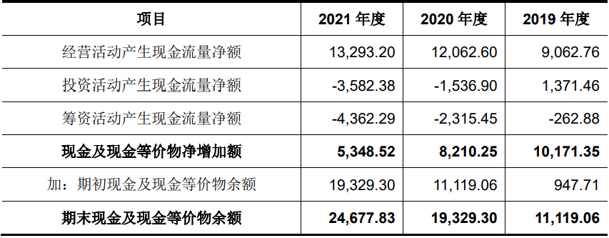 但是报告期内,该公司现金及现金等价物净增加额分别为1.02亿元、8210.25万元、5348.52万元,2021年末相比于2019年末缩减了47.42%。