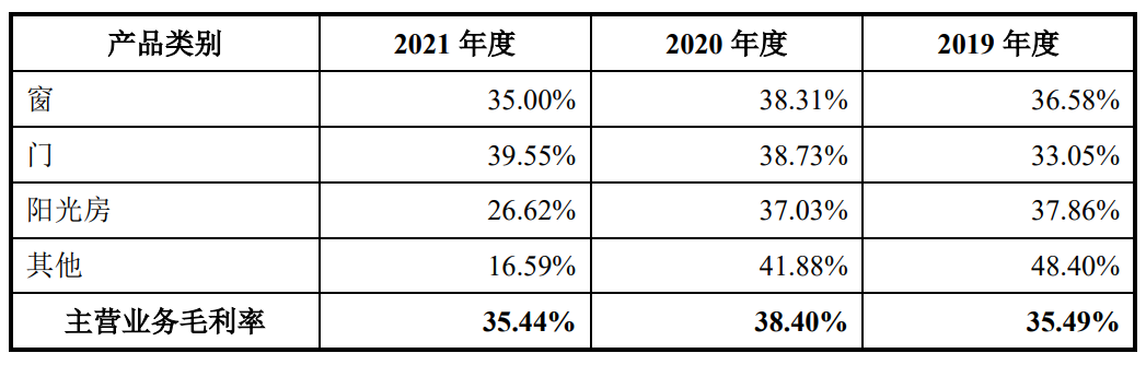 报告期内,皇派家居主营业务毛利率呈现下降趋势,分别为35.49%、38.40%和35.44%。其中,占据营业收入比例七成的窗类产品毛利率由36.58%降至35%,阳光房产品毛利率则由37.86%大幅降至26.62%。
