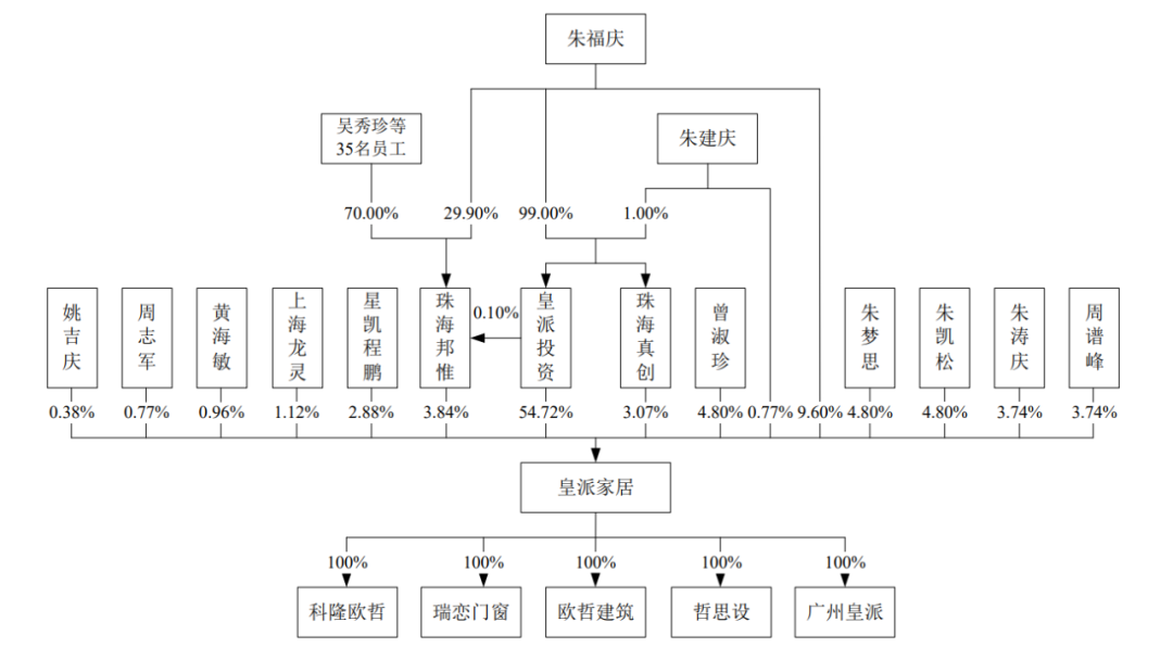 招股书显示,皇派家居是典型的家族企业,创始人朱福庆直接控制了皇派家居9.6%的股份,通过皇派投资、珠海邦惟和珠海真创3家公司间接控制了皇派家居61.63%的股份,共计控制皇派家居71.23%的股份表决权。
