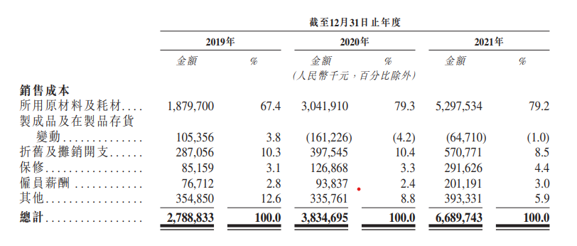 报告期内,公司销售成本分别为27.89亿元、38.35亿元和66.9亿元,主要包括原材料及耗材、制造过程中使用的制成品及在制品、生产设施及设备有关的折旧及摊销开支、保修开支、雇员薪酬等。其中,原材料及耗材占销售成本的比例分别为67.4%、79.3%和79.2%,是主要构成部分。