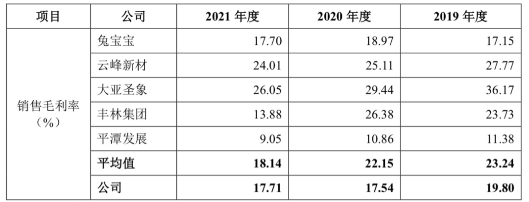 《投资时报》研究员注意到,千年舟OSB、刨花板的毛利率较低。报告期各期,该公司板材产品的毛利率分别为10.86%、8.45%、8.60%,这也拉低了其板材产品整体销售毛利率水平。同期,千年舟的销售毛利率分别为19.80%、17.54%和17.71%,而同行业可比公司同期的销售毛利率平均值分别为23.24%、22.15%、18.14%。