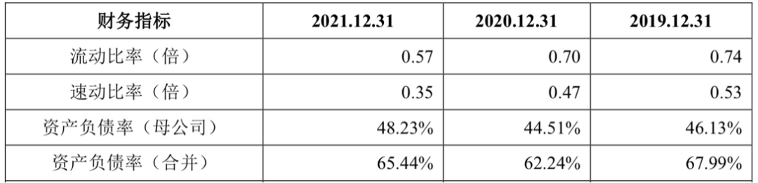 招股书显示,报告期内该公司流动比率分别为0.74、0.7、0.57;速动比率分别0.53、0.47、0.35,均低于同业可比公司平均水平。在此期间同行业可比公司流动比率的平均值分别为2.62、2.02、1.84;速动比率分别为1.49、1.31、1.17。