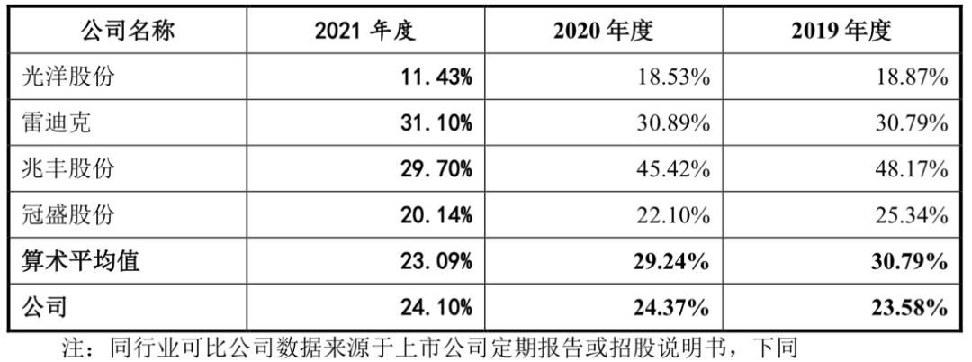 招股书显示,报告期内,斯菱股份的毛利率分别23.58%、24.37%、24.10%,同行业可比公司毛利率的平均值分别为30.79%、29.24%、23.09%。其中2019年至2020年,该公司的毛利率始终低于同行业可比公司平均值,但2021年其毛利率却反超了同行业可比公司平均值。