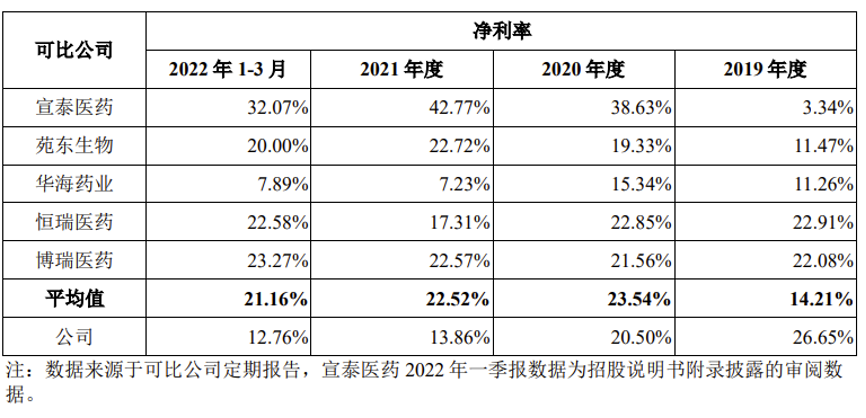 数据显示,2021年,同业可比公司平均净利润率为22.52%,远高于联亚药业的13.86%水平。对此,公司在招股书中解释为主要系股份支付费用较高,从而拉低了净利率水平。