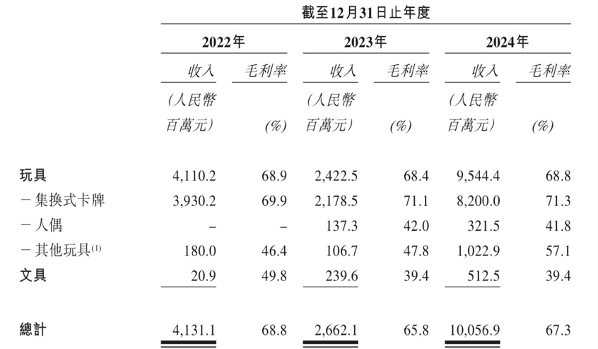 招股书显示,2022年至2024年,卡游营收分别为41.31亿元、26.62亿元、100.57亿元,对应的毛利率分别为68.8%、65.8%和67.3%,核心产品集换式卡牌的毛利率更是达到69.9%、71.1%和71.3%。同期,泡泡玛特的毛利率为57.49%、61.32%和66.79%。