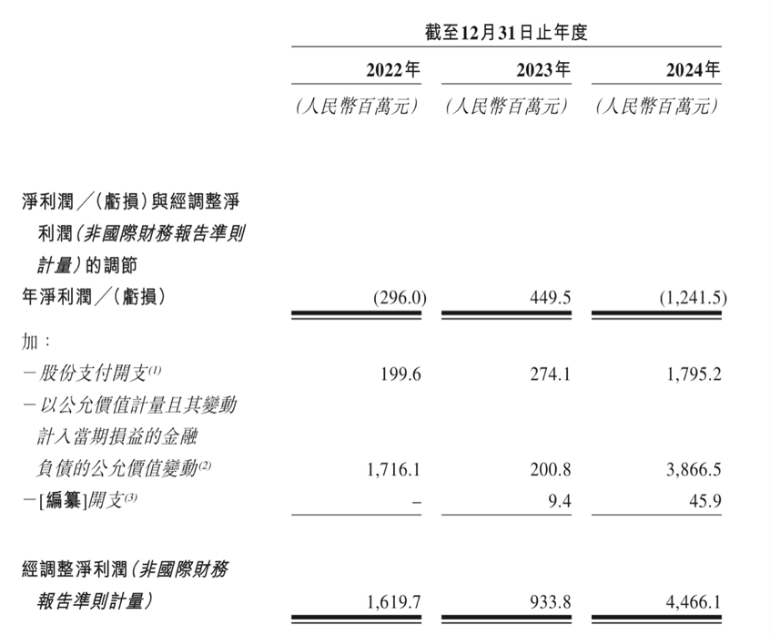招股书显示,2022年至2024年,卡游录得金融负债的公允价值变动分别为17.16亿元、20.08亿元及38.66亿元,同期公司的净利润分别为-2.96亿元、4.50亿元和-12.42亿元,而对应的经调整净利润则分别为16.20亿元、9.34亿元、44.66亿元。