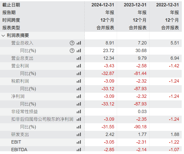 不过,云英谷科技目前还处于亏损状态。据招股书披露,虽然公司已成为智能手机AMOLED显示驱动芯片市场头部玩家,相关产品销售量从2022年的超1400万颗,增加到2024年的超5100万颗,营业收入也由2022年的5.51亿元增长至2024年的8.91亿元,但前述三年内,该公司净利润分别为-1.24亿元、-2.32亿元和-3.09亿元,持续亏损且呈逐年扩大趋势,累计亏损金额已超6.65亿元。