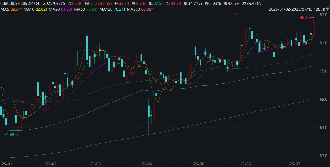 二级市场方面,6月21日,在首次披露赴港上市消息当天,澜起科技还发布了股份回购计划,公司拟以自有资金回购金额不低于2亿元,不超过4亿元的公司股份。对此,投资者反应并不积极。6月23日开盘,澜起科技股价低开低走,当日股价下跌4.36%,收报于78.01元/股(不复权)。截至7月15日收盘,澜起科技收报85.3元/股,最新市值为977亿元。