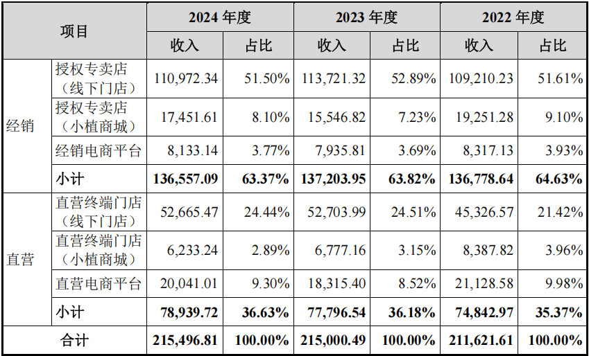 在经营模式方面,植物医生以经销模式为主、直营模式为辅。2022年至2024年(下称报告期),该公司经销模式收入占主营业务收入的比例在64%左右,直营模式收入占比在36%左右。授权专卖店(线下门店)为植物医生最主要的销售渠道,该模式各年度收入占比均超50%。