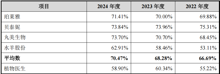 在此背后,植物医生的营收增长也不明显,报告期内,该公司营业收入分别为21.17亿元、21.51亿元、21.56亿元,2024年营收同比仅增长0.23%。同时,该公司主营业务毛利率分别为55.22%、60.34%、58.90%,低于可比公司。