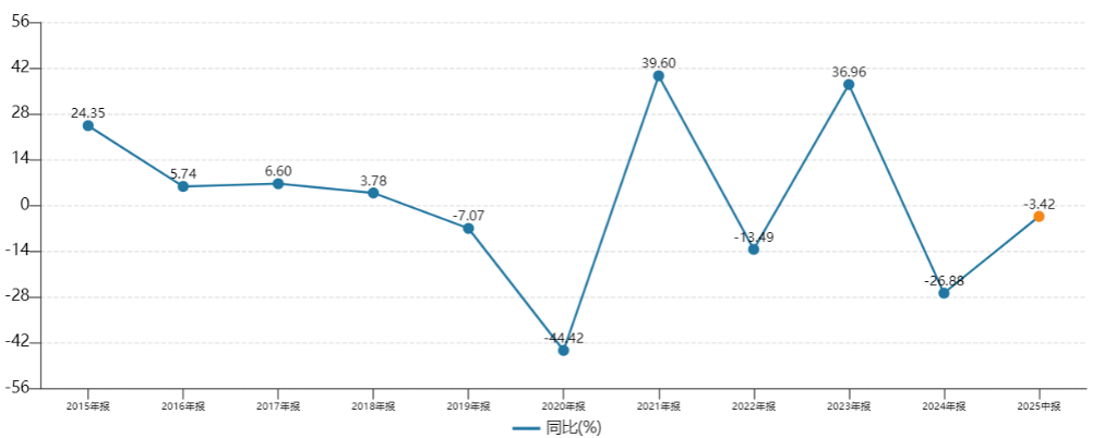 但是,市场端的反馈似乎并不显著。业绩方面,2020年至2024年,海澜之家营收增速呈“过山车”式波动,分别为-18.26%、12.41%、-8.06%、15.98%和-2.65%,2025半年报显示,公司上半年实现营收115.66亿元,同比增长1.73%。同期,公司归母净利润的变化趋势亦起伏不定,2020年至2024年该指标同比增速分别为-44.42%、39.6%、-13.49%、36.96%和-26.88%,2025年上半年归母净利润为15.8亿元,同比下降3.42%。