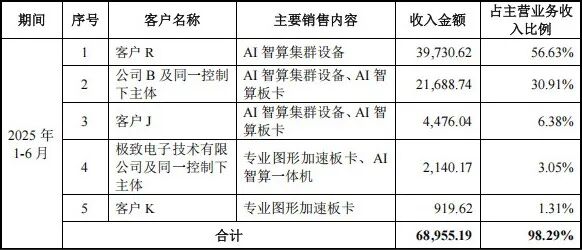 但公司也提示了一些风险,除了尚未实现盈利、被美国列入“实体清单”、技术和产品迭代风险外,也包括客户集中度较高、供应商集中度偏高及关联采购占比较高的情况。如2023年、2024年、2025年上半年,该公司向前五大客户销售额占比均在97%以上。公司解释称,主要销售产品中,AI智算产品与专业图形加速集群设备销售占比增长,因这两者单个合同金额较大,故向前五大客户销售占比维持较高水平。