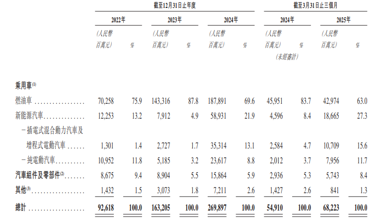 奇瑞汽车按产品类别划分的收入明细(2022年至2024年及2025年一季度)