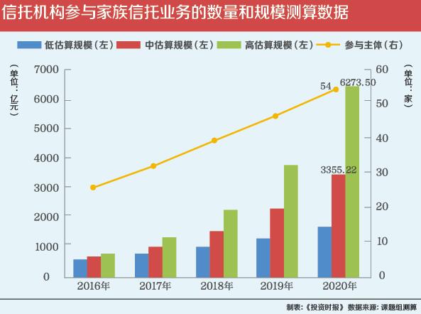 2014年4月初,中国银监会出台《中国银监会办公厅关于信托公司风险监管的指导意见》(“99 号文”),在转型方向中明确提出“探索家族财富管理,为客户量身定制资产管理方案”,从监管层面指明家族信托未来的发展方向。假设平均每年新增7家信托机构参与家族信托业务,以2015年的441.84亿元作为家族信托业务规模的基准,以30%、50%和70%作为家族信托业务规模的测算基准,到2020年参与家族信托业务的机构数量将达54家,中等估算规模将达3355.22亿元,高估算规模为6275.5亿元。
