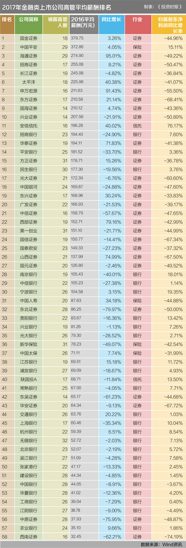 有人欢喜有人愁。根据wind提供的数据计算,有37家上市金融机构的高管人均薪酬在2016年出现了缩水,9家公司的降幅超过三成,分别为东北证券、中原证券、西南证券、东吴证券、中信证券、新华保险、南京银行、上海银行和平安银行。