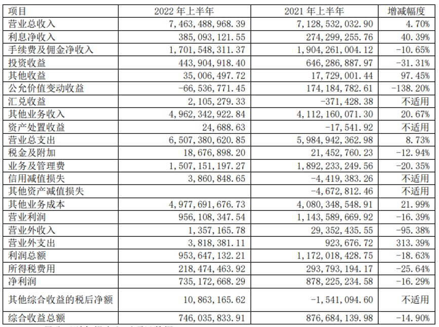 浙商证券2022年中期利润表主要项目数据(单位:元)