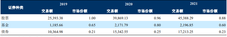 根据中诚信国际5月末出具的《东莞证券股份有限公司2022年度跟踪评级报告》,2021年东莞证券代理买卖股票市场份额为0.88%,同比下降0.08个百分点;代理买卖基金市场份额为0.6%,同比下降0.2个百分点;代理买卖债券市场份额为0.23%,同比下降0.02个百分点。