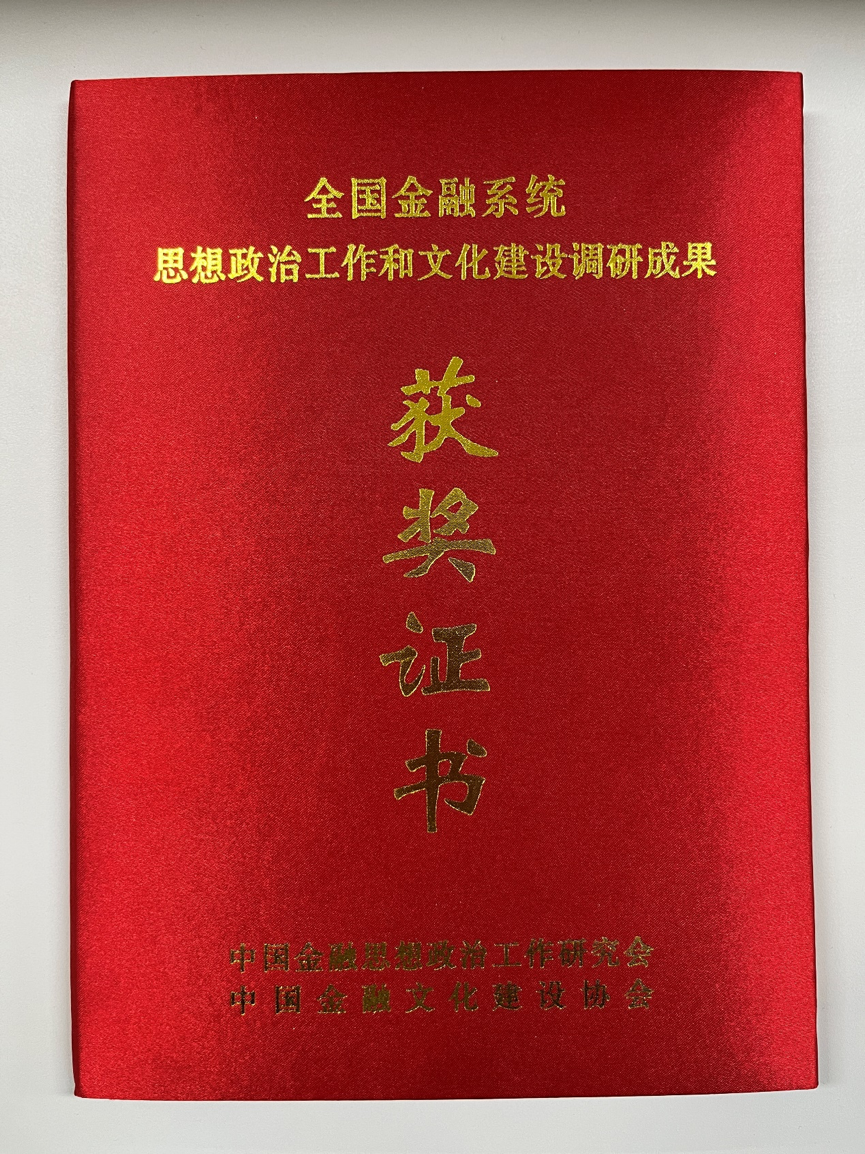 近日,云南信托调研报告《洞察思想动态 促进信托青年成长成才——云南信托调研样本分析》经中国金融思想政治工作研究会专家评审委员会评议,荣获2022年全国金融系统思想政治工作和文化建设调研成果三等奖,获颁“2022全国金融系统思想政治工作和文化建设调研成果”证书,并被《中国金融业党的建设与思想文化建设调研成果库》收录。