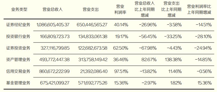 进一步细分来看,2022年该公司证券经纪业务总收入为10.87亿元,同比下降26.96%;投资银行业务总收入为1.67亿元,同比下降56.45%;证券投资业务总收入为3.27亿元,同比下降67.98%;资产管理业务总收入为4.94亿元,同比增长82.67%;信用交易业务总收入为8.61亿元,同比下降13.82%;基金管理业务总收入为6.75亿元,同比下降2.97%。
