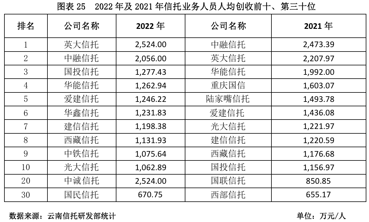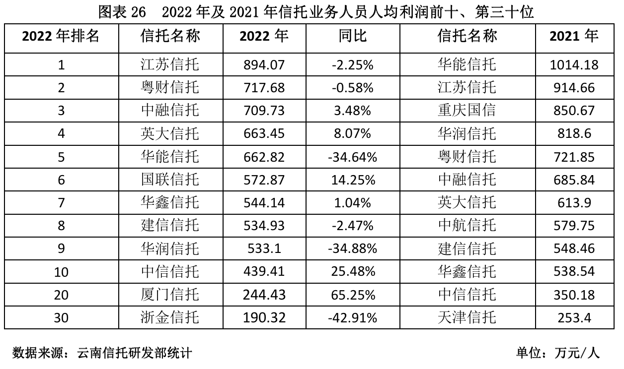 依据目前信托公司人员规模的数据,2022年行业的人均利润为189.40万元/人,与2021年的239.66万元/人相比下滑20.97%。如表26所示,江苏信托、粤财信托、中融信托、英大信托、华能信托均为人均净利润靠前的信托公司。