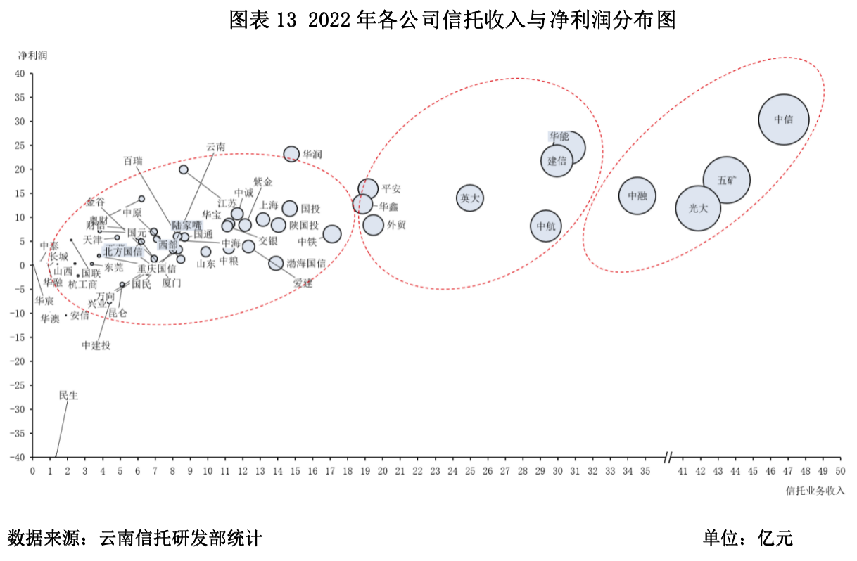 结合2022年信托业务收入与净利润看,信托行业头部效应显著,各梯队公司分布相对稳定。具体来看,第一梯队的信托公司,信托业务收入分布在30亿元以上,中信信托遥遥领先同业,中信、五矿、光大、中融在第一梯队。第二梯队的信托公司,其信托业务收入分布在18-30亿元,净利润分布在8-25亿元,包含华能信托、建信信托、中航信托、英大信托等。第三梯队信托公司,大部分净利润大多分布在9亿元以下,信托业务收入分布在20亿元以下,行业大部分的公司都集中于该梯队,分布相对密集,与第一、第二梯队之间的差距明显。