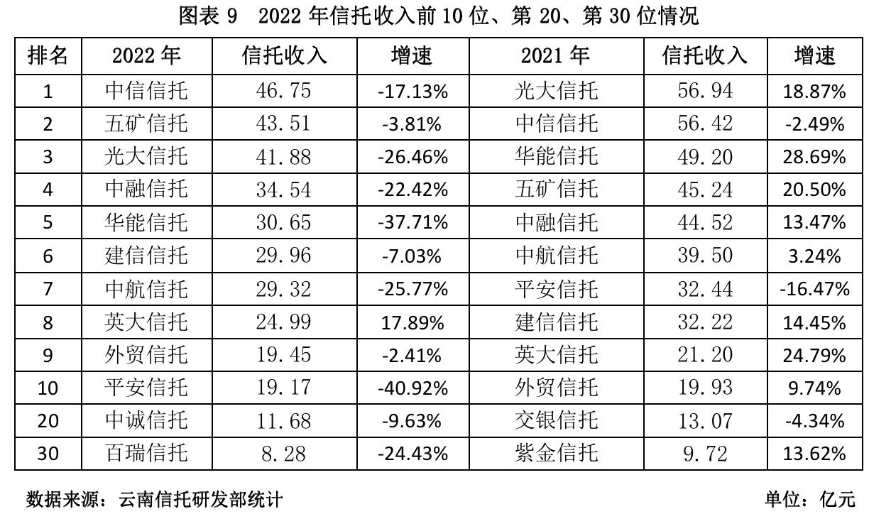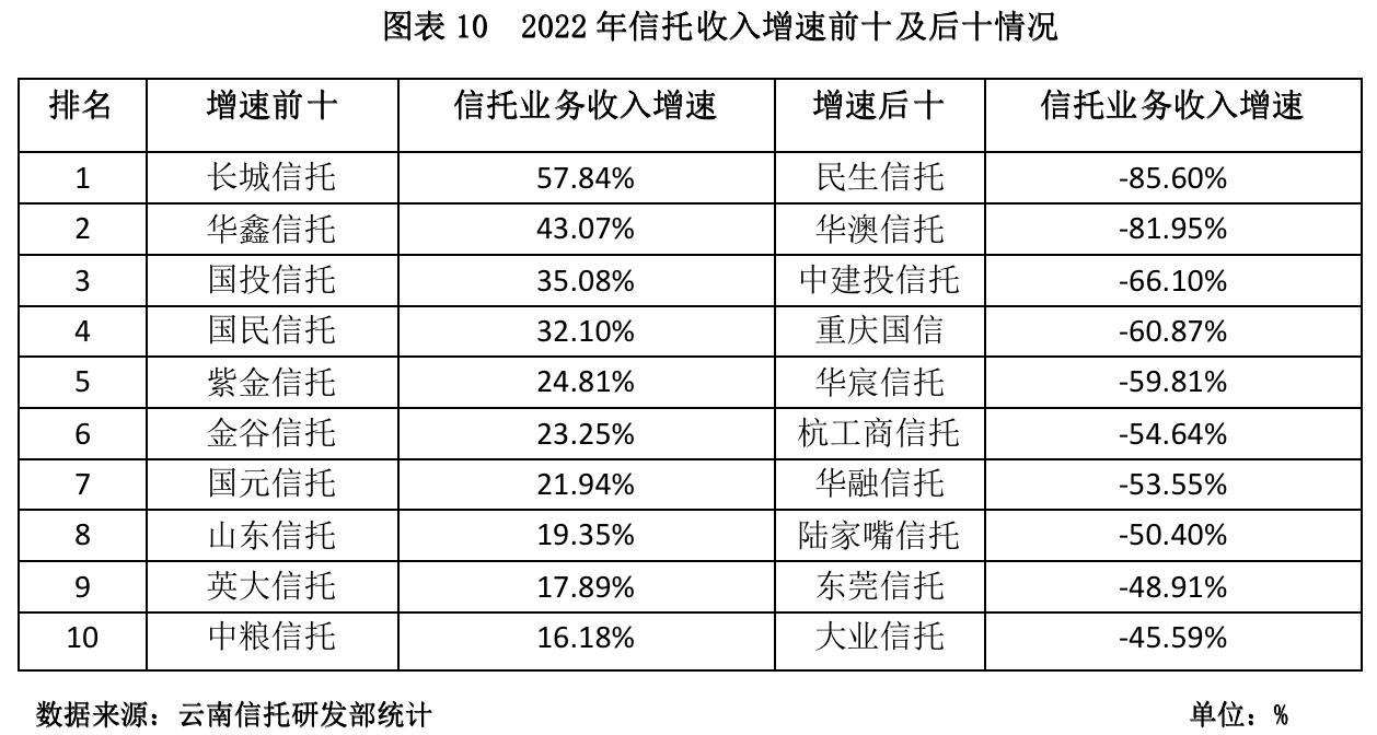 增速方面,2022年信托收入增速最快十家公司及下降最快的十家公司如图表10所示,信托业务收入增速最高五家公司为长城信托(57.84%)、华鑫信托(43.07%)、国投信托(35.08%)国民信托(32.10%)、紫金信托(24.81%)。