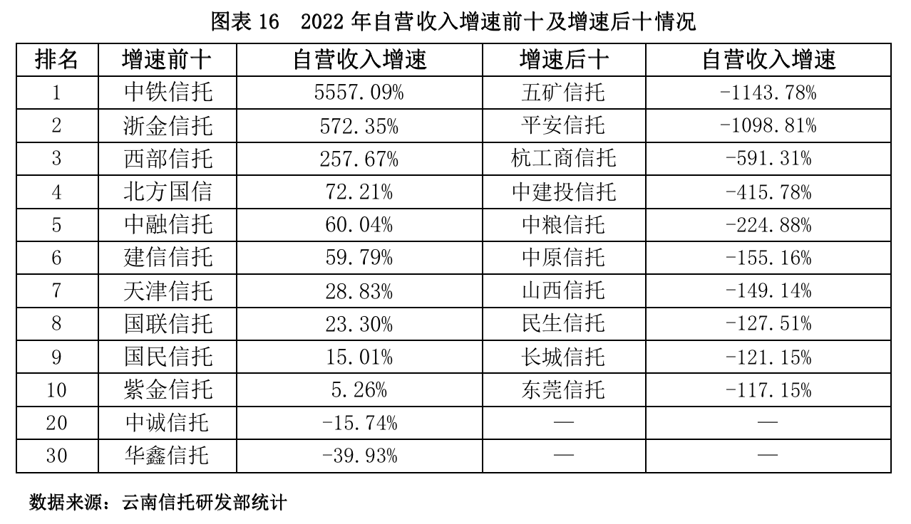 收入增速方面,增速最大信托公司是中铁信托,增速过大主要是因为前年的收入基数较小,其次是浙金信托自营收入增速572.35%。自营收入增速较高的还有西部信托(257.67%)、北方信托(72.21%)、中融信托(60.04%),同比增速均超过60%,三家公司均由于2021年基数过小缘故,分别由2021年的0.36亿元、0.87亿元、4.51亿元增长到2022年的1.28亿元、1.49亿元、7.22亿元。