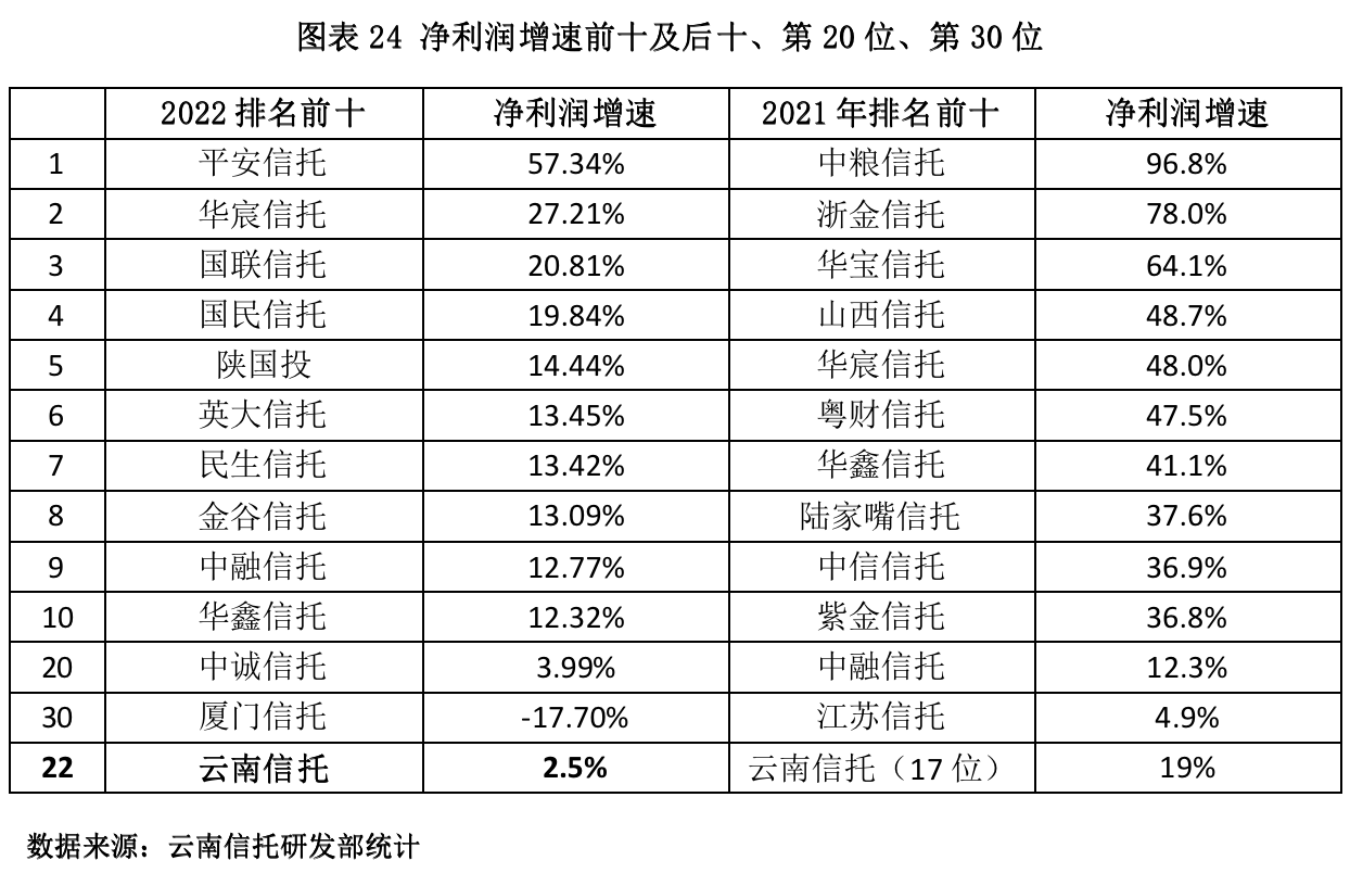 2022年净利润增速最高10家公司及下降最快十家公司如图表24所示,平安信托以57.34%高增速位居行业第一,华宸信托(27.21%)和国联信托(20.81%)增速排名分别为第二和第三,与2021年净利润基数过小存在一定的关系。