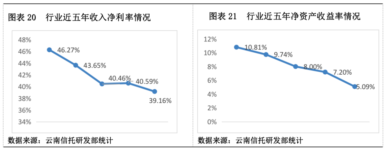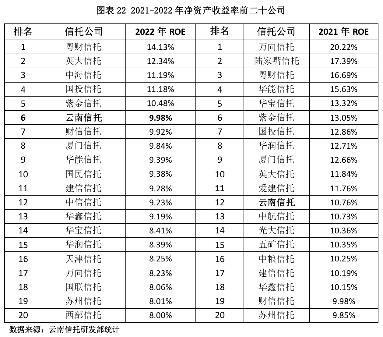 净资产收益率排名靠前公司包括粤财信托、英大信托、中海信托、国投信托、紫金信托,净资产收益率均在10%以上,云南信托净资产收益率为9.98%,从去年第12位上升到行业第6位,在行业净利润整体大幅下滑趋势下上升明显。