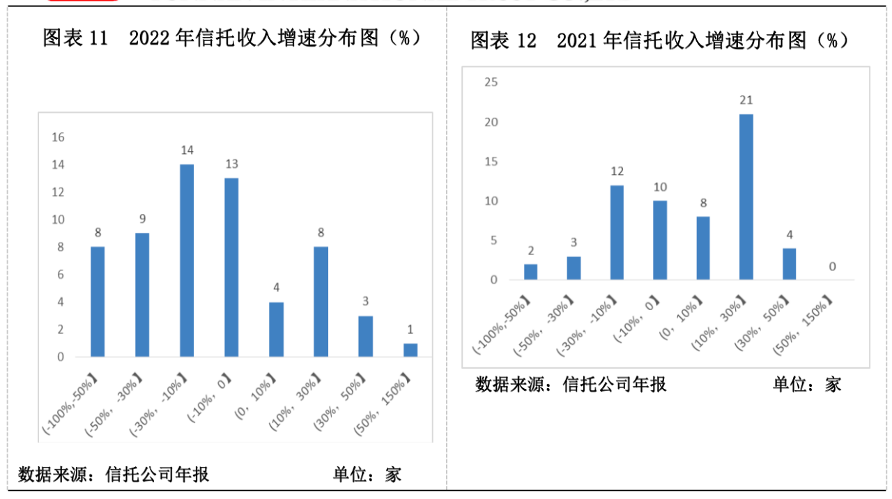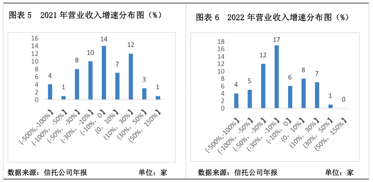 观察营收增速分布图,2022年位于高增长区间的信托公司明显减少,位于减少区间公司增加,行业整体增速比去年减弱。其中,在正增长公司占比26.66%,营业收入增长的信托公司数量与2021年相比减少8家,增长区间位于10%-30%、30%-50%、50%-100%区间信托公司分别减少5家、2家、1家。在负增长区间,增长在-10%-0区间信托公司减少8家,增长分布最为集中是-50%至-30%、-30%至-10%的区间,公司数量分别为17家、12家,分别增加7家与4家,另外-500%至-100%、-100%至-50%区间信托公司数量为4家、5家,分别增加0家与4家。