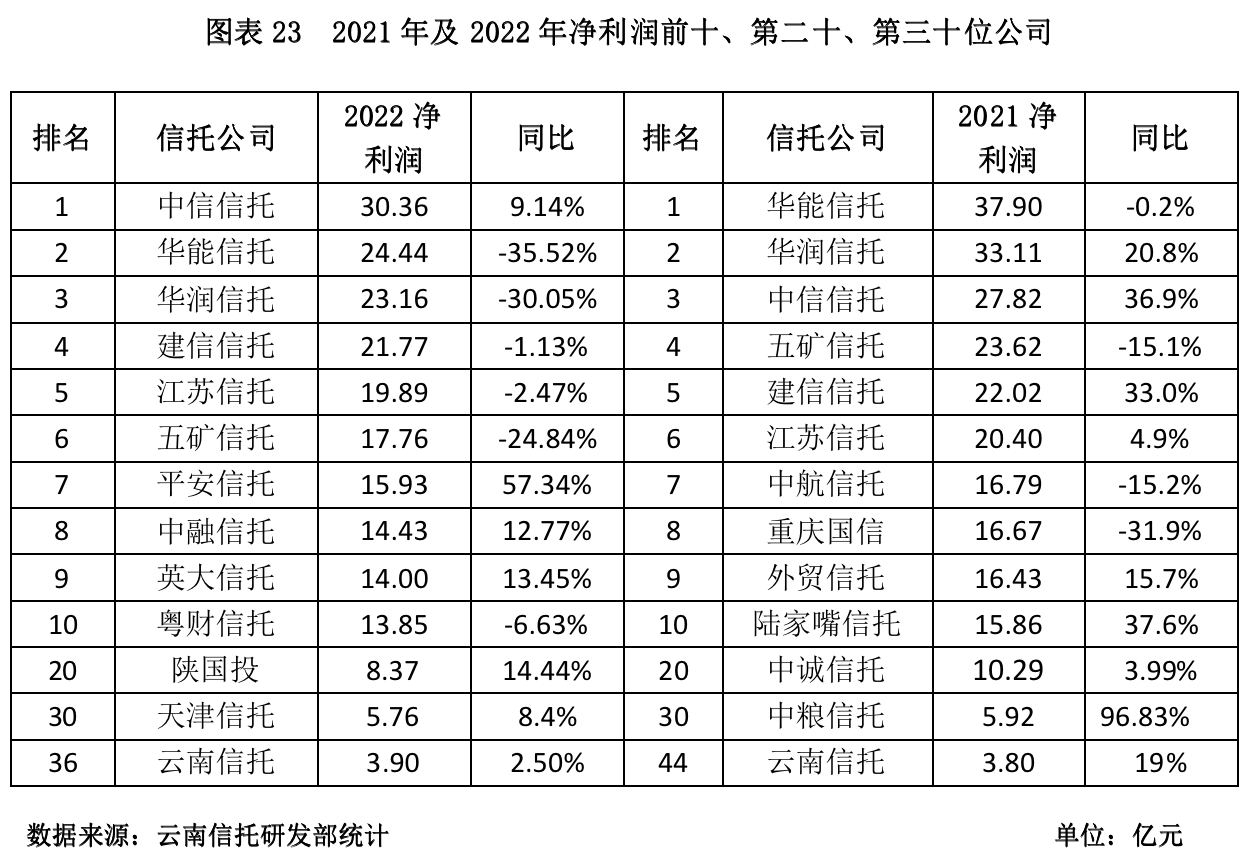 观察行业整体情况,20家公司实现正增长,40家公司出现负增长。下表为2022年净利润前十公司情况,中信信托以30.36亿元的净利润位居首位,净利润同比增长9.14%,华润信托、建信信托、江苏信托成为新晋排名靠前信托公司。