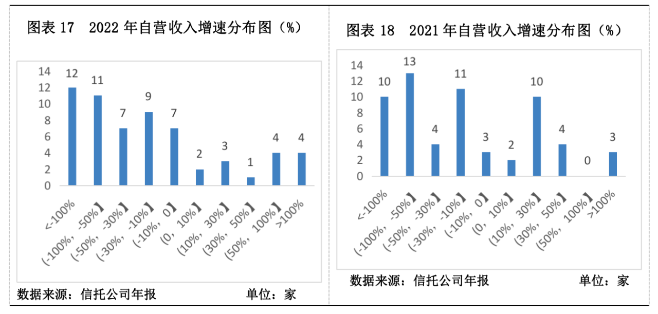 图表21为自营收入增速分布图,可以看到自营收入增速0%以上信托公司为14家,其中自营收入增长超过50%为8家。增长区间分布数量最多的是-50%以下的公司数量占比20%,另外一个集中区间是0至-50%,数量占比38.33%。与2021年信托公司在不同区间的分布比较零散不同,2022年呈现向负增长区间集中。