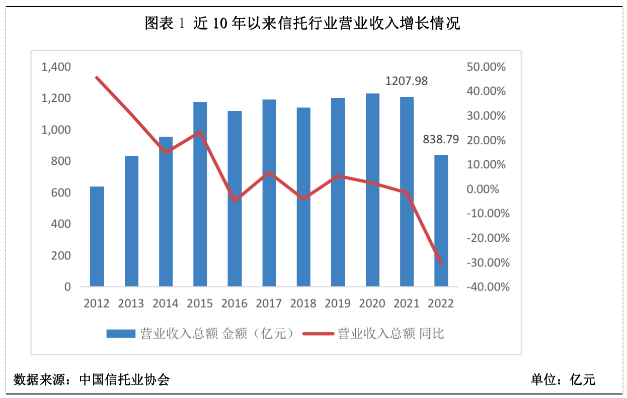 依据信托业协会数据,行业68家公司营业收入为838.79亿元,同比减少30.56%。近10年以来信托行业营业收入复合增长率为0.07%,营业收入从2017年以来基本维持在1200亿元上下波动,但是2022年则呈现出断崖式的下跌,截止2022年5月4号,八家信托公司延迟公布年报。依据60家公司已公布年报,营业收入861.98亿元,同比下滑20.37%,比行业整体68家公司略高些。