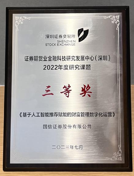 近日,国信证券申报的《基于人工智能推荐赋能的财富管理数字化运营》项目获深交所主办的证券期货业金融科技研究发展中心(以下简称“金融科技中心”)2022年度研究课题三等奖。