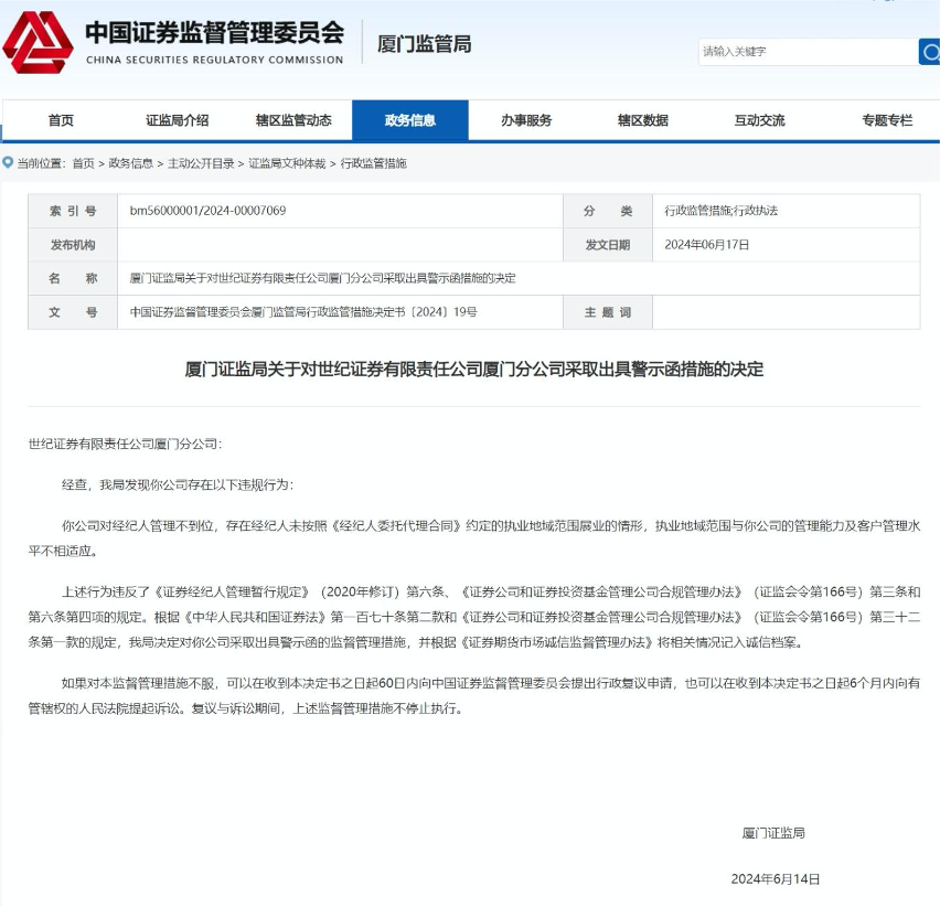 具体来看,6月14日,厦门证监局决定对世纪证券厦门分公司采取出具警示函的监督管理措施,并根据《证券期货市场诚信监督管理办法》将相关情况记入诚信档案。