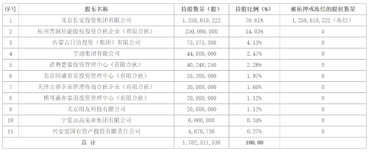 根据国融证券官网信息,该公司的股份分散在11家股东手中。其中,第一大股东北京长安投资集团有限公司(下称长安投资集团)持股数量约12.59亿股,持股比例高达70.61%;第二大股东杭州普润星融股权投资合伙企业(有限合伙)持股比例为14.03%;其余9家股东的持股比例均在5%以下。