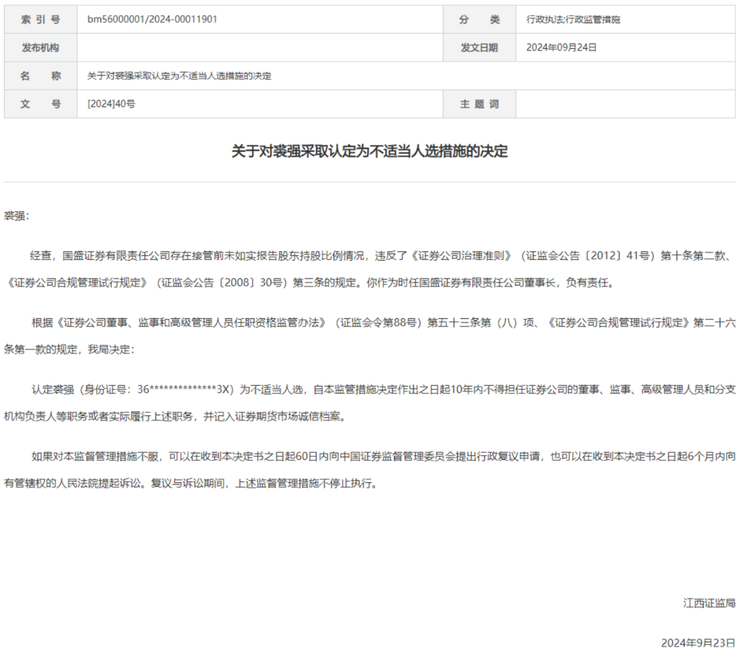 据中国证监会官网近日发布的信息,2024年9月23日,裘强被江西证监局认定为不适当人选,10年内不得担任证券公司的董、监、高等职务。原因是国盛证券存在接管前未如实报告股东持股比例情况,时任国盛证券董事长裘强负有责任。