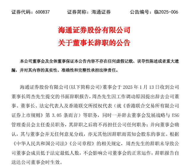 2025 年1月13日,海通证券公告,该公司董事会于当日收到公司董事长周杰提交的书面辞职报告,周杰因工作调动原因提出辞去公司董事、董事长、法定代表人及相关职务,其辞职之后将不再担任公司任何职务。根据相关规定,周杰的辞职未导致该公司董事会成员低于法定最低人数,不会影响公司董事会的正常运作。